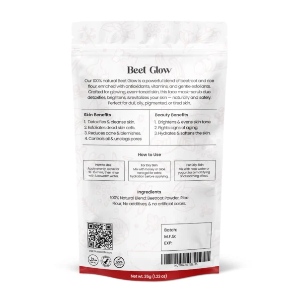 Regular use of Beet Glow may help reduce pigmentation, lighten blemishes, control excess oil, and restore youthful radiance. Its dual action makes it effective as an exfoliating scrub as well as a nourishing mask, giving your skin a healthy, refreshed look.