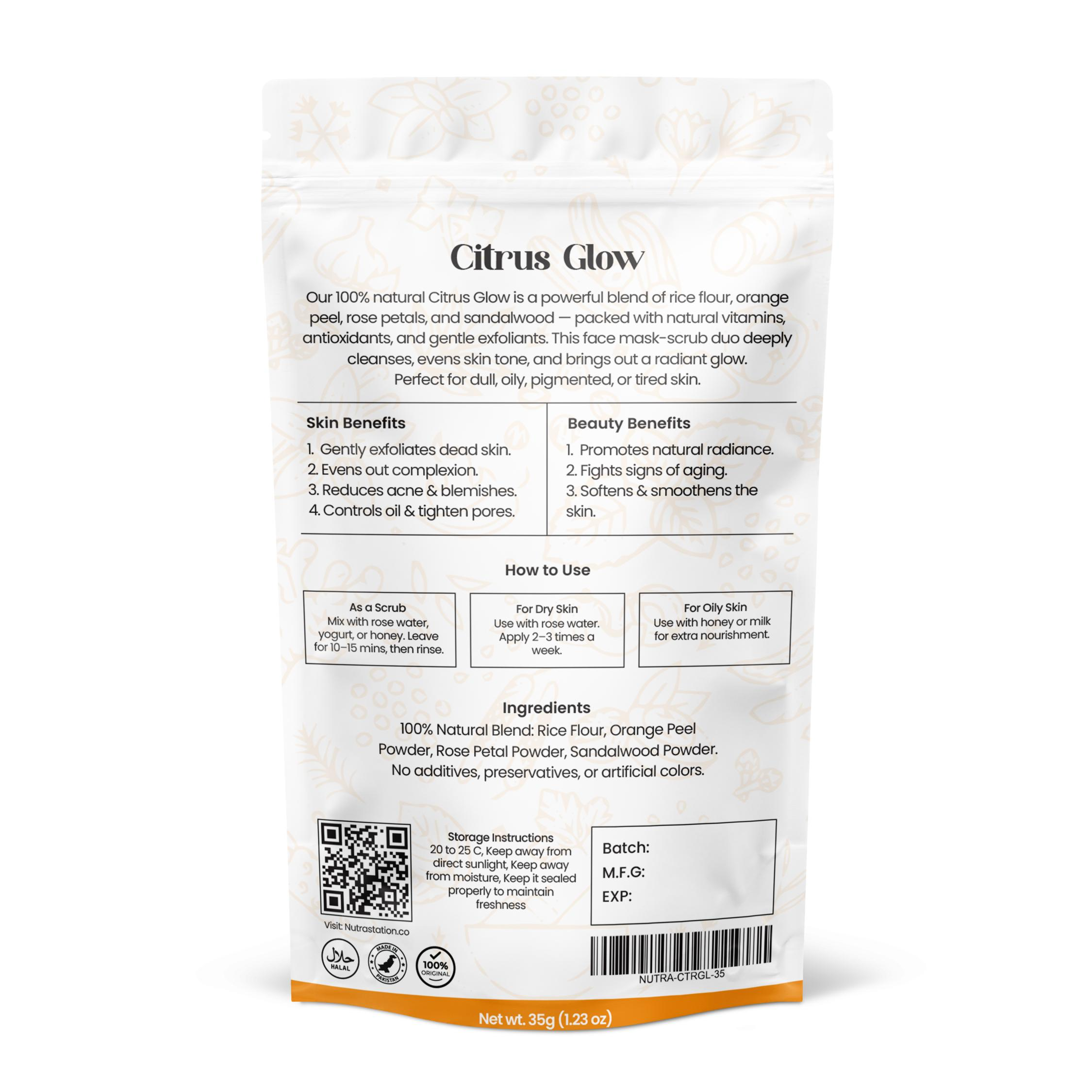 Nutra Station Citrus Glow is a unique herbal blend that combines the natural freshness of orange peel, the gentle exfoliation of rice flour, and the soothing effect of rose petals. Orange peel is rich in vitamin C and antioxidants, which help brighten the complexion, reduce pigmentation, and fight free radicals. Rice flour gently scrubs away dead skin cells, unclogs pores, and improves skin texture, while rose petals calm and hydrate the skin, leaving it soft and refreshed.
