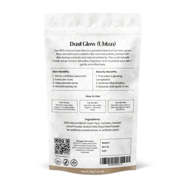 Nutra Station Dust Glow is a natural herbal Ubtan inspired by age-old beauty rituals. Made from a unique blend of finely ground herbs, natural clays, and plant extracts, this traditional formula is designed to cleanse, exfoliate, and brighten the skin while maintaining its softness and moisture balance.